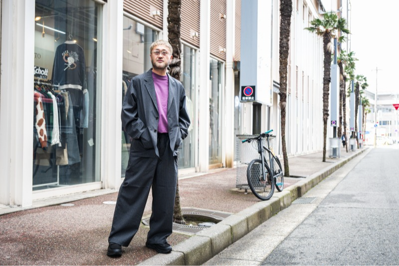 markaのジャケット49,500円、イージーパンツ35,200円、MOISTHROUGH 360のローファースニーカー28,600円(全て税込)※Tシャツは私物