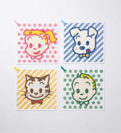 今回は、代表的なキャラクターである、ジル・ジャック・キャット・ドッグの四種類をかや織ふきんにしました。